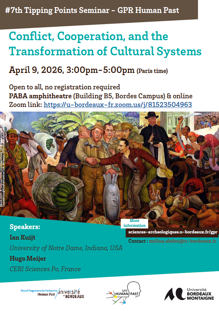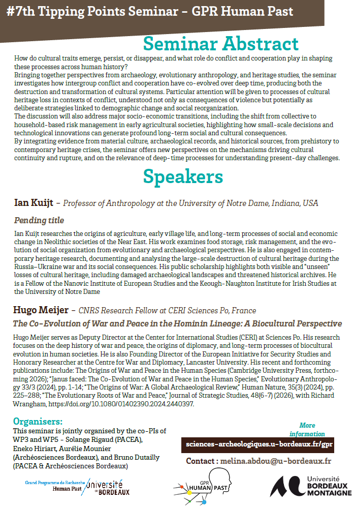 How do cultural traits emerge, persist, or disappear, and what role do conflict and cooperation play in shaping these processes across human history? Bringing together perspectives from archaeology, evolutionary anthropology, and heritage studies, the seminar investigates how intergroup conflict and cooperation have co-evolved over deep time, producing both the destruction and transformation of cultural systems. Particular attention will be given to processes of cultural heritage loss in contexts of conflict, understood not only as consequences of violence but potentially as deliberate strategies linked to demographic change and social reorganization. The discussion will also address major socio-economic transitions, including the shift from collective to household-based risk management in early agricultural societies, highlighting how small-scale decisions and technological innovations can generate profound long-term social and cultural consequences. By integrating evidence from material culture, archaeological records, and historical sources, from prehistory to contemporary heritage crises, the seminar offers new perspectives on the mechanisms driving cultural continuity and rupture, and on the relevance of deep-time processes for understanding present-day challenges.